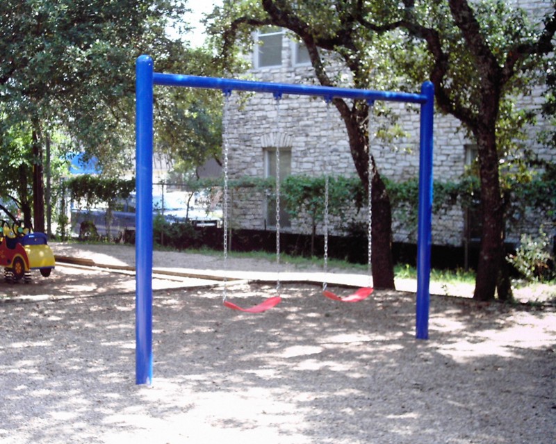 A very durable swing set. Galvanized steel 5" diameter posts and 3.5" diameter top rail. Available in red, blue or green powder coating finish. It comes complete with chains and 2 strap seats. Fully enclosed bucket seats are available for an additional charge.